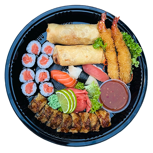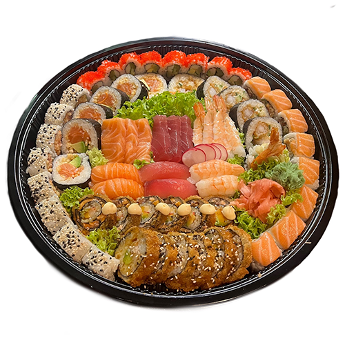 Sexy roll 8 stuks, Tokyo roll 8 stuks, in-out roll pikante tonijn getopt met tonijn 8 stuks, kamikaze soya wrap zalm en tempura maki soya wrap 6/6 stuks, dragon eyes en Manhattan 6/6 stuks, nigiri 6 stuks, sashimi 8 stuks.