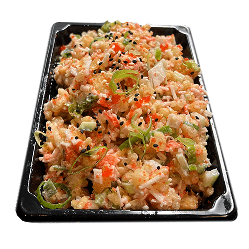 Zoete rijst met zalm, avocado, komkommer, wortel, zeewiersalade, edamame, masago en surimi, pikante mayonaise en teriyaki sauce.